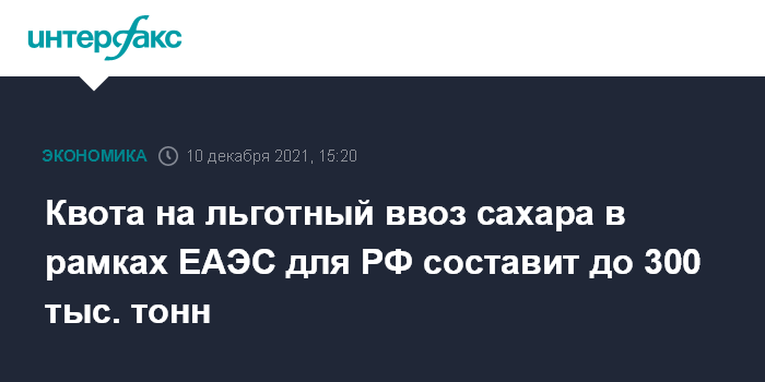 Москва. 10 декабря. INTERFAX.RU - Совет Евразийской экономической комиссии (ЕЭК) утвердил тарифную льготу на ввоз сахара до 31 августа 2022 года, сообщается в пресс-релизе комиссии.