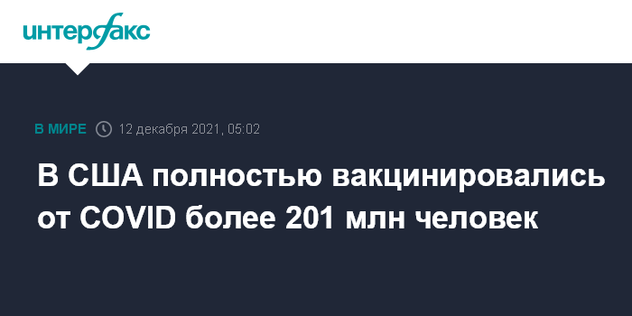 Москва. 12 декабря. INTERFAX.RU - В Соединенных Штатах по состоянию на утро субботы от коронавируса полностью привиты 201 млн 688 тыс. 550 человек, сообщили американские Центры по контролю и профилактике заболеваний.