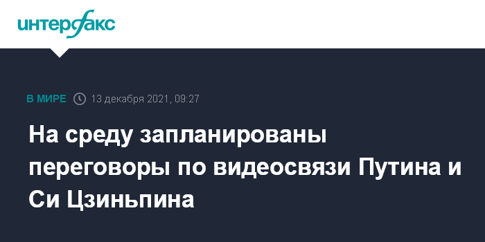 Москва. 13 декабря. INTERFAX.RU - Председатель КНР Си Цзиньпин рассчитывает в среду, 15 декабря, провести переговоры с президентом России Владимиром Путиным в режиме видеосвязи, сообщила представитель МИД КНР Хуа Чуньин.