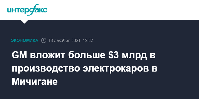 Москва. 13 декабря. INTERFAX.RU - Американский автопроизводитель General Motors Co. планирует инвестировать более $3 млрд в производство электромобилей в Мичигане, пишет The Wall Street Journal со ссылкой на осведомленные источники.