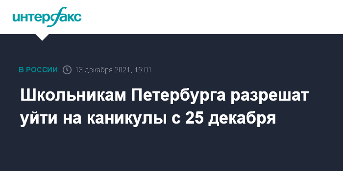 Москва. 13 декабря. INTERFAX.RU - В Петербурге школьные каникулы начнутся с 25 декабря, но школам разрешат до 28 декабря работать по свободному расписанию, сообщила во "ВКонтакте" вице-губернатор Ирина Потехина.