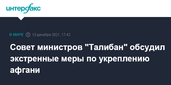 Москва. 13 декабря. INTERFAX.RU - Сформированный захватившим Афганистан движением "Талибан" (запрещенная в России террористическая организация) Совет министров провел экстренное заседание. Об этом сообщил официальный представитель движения Забихулла Муджахид в твиттере.
