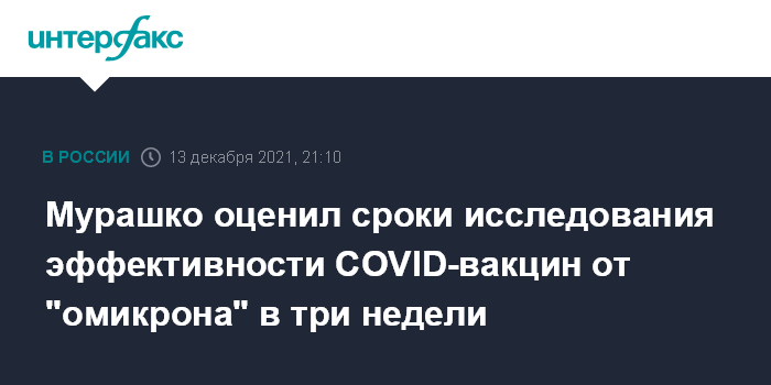 Москва. 13 декабря. INTERFAX.RU - Исследование эффективности "Спутника V" и других вакцин от коронавируса к штамму "омикрон" займут до трех недель, заявил глава Минздрава Михаил Мурашко.