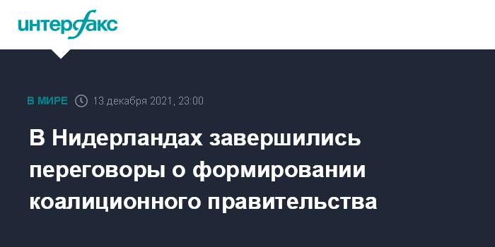 Москва. 13 декабря. INTERFAX.RU - В Нидерландах завершились переговоры о формировании нового коалиционного правительства, в среду ожидается представление программы кабинета в парламенте, сообщает в понедельник издание Dutch News.