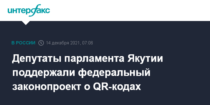 Москва. 14 декабря. INTERFAX.RU - Большинство народных депутатов Госсобрания Якутии (Ил Тумэн) поддержали проект федерального закона о введении QR-кодов в общественных местах.