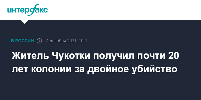 Москва. 14 декабря. INTERFAX.RU - Суд Чукотского автономного округа приговорил 35-летнего местного жителя к 19,5 годам заключения в колонии строгого режима за двойное убийство и другие преступления, сообщает во вторник региональная прокуратура.