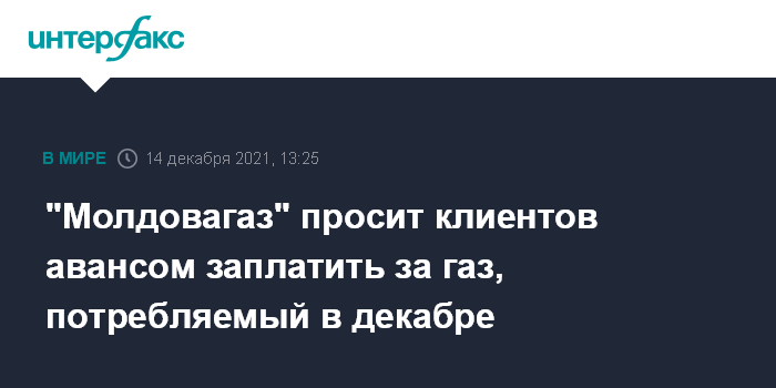 Москва. 14 декабря. INTERFAX.RU - Председатель правления АО "Молдовагаз" Вадим Чебан попросил экономических агентов авансом заплатить за газ, потребляемый в декабре.