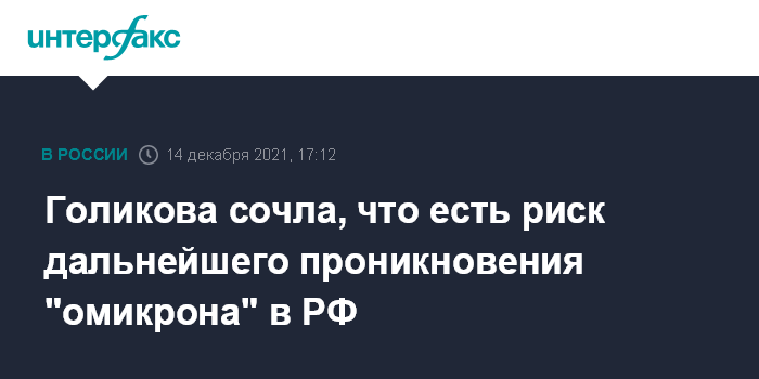 Москва. 14 декабря. INTERFAX.RU - Риск дальнейшего проникновения штамма коронавируса "омикрон" в Россию на новогодних праздниках не исключен. Об этом заявила вице-премьер РФ Татьяна Голикова.