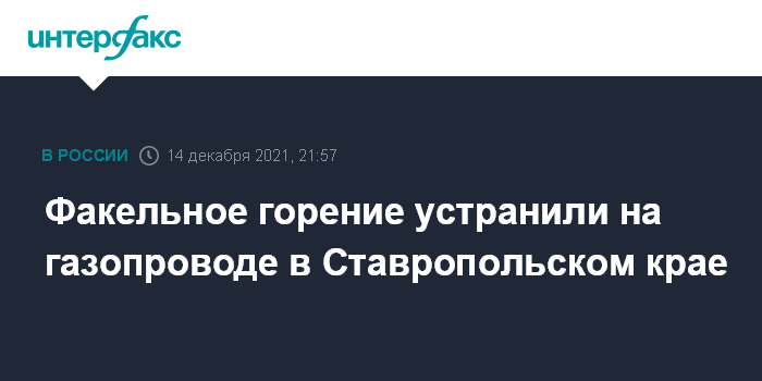 Москва. 14 декабря. INTERFAX.RU - Факельное горение устранено на газопроводе в Кочубеевском округе Ставропольского края, сообщила представитель пресс-службы Главного управления МЧС по Ставропольскому краю Юлия Дашкевич.