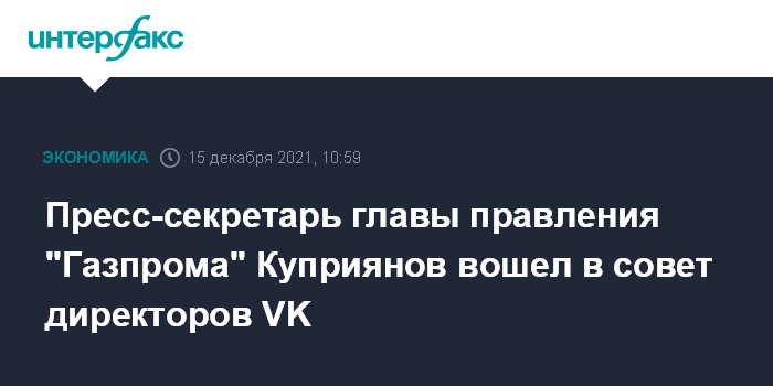 Москва. 15 декабря. INTERFAX.RU - Пресс-секретарь председателя правления "Газпрома", член совета директоров АО "Газпром-Медиа Холдинг" Сергей Куприянов вошел в совет директоров VK (ранее известная как Mail.ru Group), говорится в сообщении интернет-холдинга.