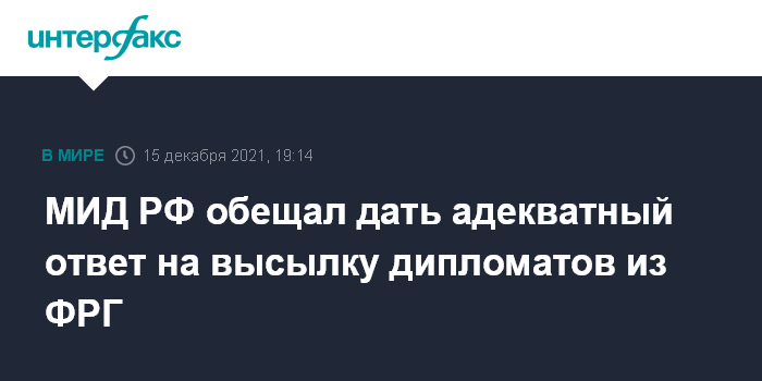 Москва. 15 декабря. INTERFAX.RU - Россия даст адекватный ответ на высылку двух своих дипломатов из Германии. Об этом заявили в МИД РФ.