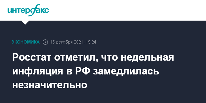 "За неделю с 7 по 13 декабря инфляция замедлилась до 0,06% после 0,07% неделей ранее. Продолжилось снижение цен в секторе туристических и регулируемых услуг (минус 0,90% после минус 0,83%) за счет услуг зарубежного туризма (поездка в Турцию: минус 21,65% после минус 17,11% неделей ранее). На непродовольственные товары рост цен замедлился до 0,15% (c 0,23% неделей ранее), в том числе за счет снижения темпов удорожания автомобильного бензина до 0,20% (с 0,36% неделей ранее). На продовольственные товары цены выросли на 0,36% (после 0,20% неделей ранее) при росте цен на плодоовощную продукцию на 1,31%", - говорится в докладе Минэкономразвития.