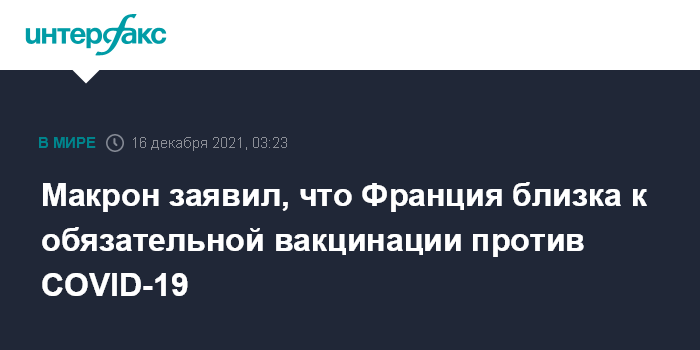 Москва. 16 декабря. INTERFAX.RU - Президент Франции Эммануэль Макрон считает, что страна почти подошла к введению обязательной вакцинации против коронавируса COVID-19.