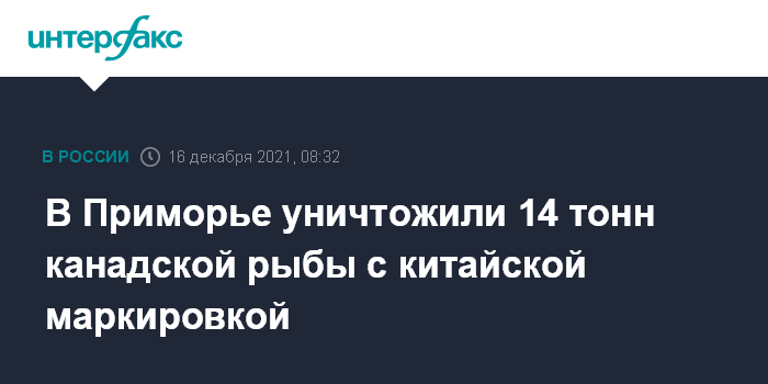 Москва. 16 декабря. INTERFAX.RU - В Приморском крае после проверки уничтожили более 14 тонн сига и палии (озерной форели) которые по документам были китайскими, а на самом деле оказались канадского происхождения, сообщили в управлении Россельхознадзора по Приморскому краю и Сахалинской области.