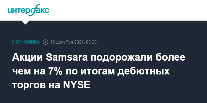 Москва. 16 декабря. INTERFAX.RU - Акции американской компании в сегменте интернета вещей (IoT) Samsara подорожали на 7,39%, до $24,7 по итогам дебютных торгов на Нью-йоркской фондовой бирже в среду.