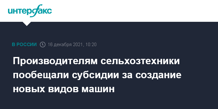 Москва. 16 декабря. INTERFAX.RU - Производители сельскохозяйственной техники и оборудования с 2022 года смогут получить федеральное финансирование на разработку и выпуск новых видов продукции, а также на модернизацию действующих производств, сообщила пресс-служба правительства.