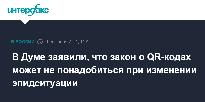 Москва. 16 декабря. INTERFAX.RU - Председатель комитета Госдумы по безопасности Василий Пискарев заявил, что судьба и действие законопроекта о QR-кодах для общественных мест зависит от эпидемиологической ситуации.
