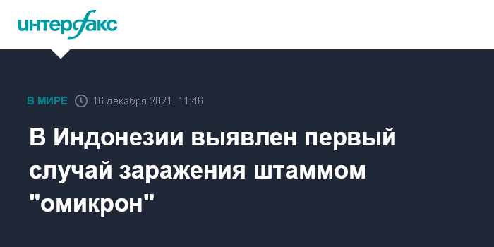 Москва. 16 декабря. INTERFAX.RU - В Индонезии выявили первый случай заражения штаммом коронавируса COVID-19 "омикрон". Об этом сообщает агентство Associated Press.
