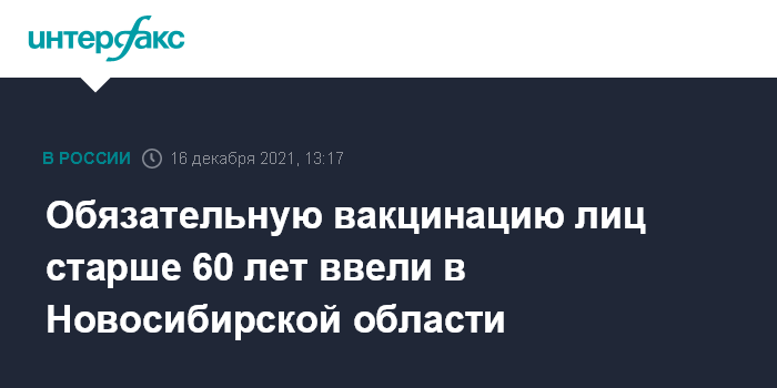 Москва. 16 декабря. INTERFAX.RU - В Новосибирской области по постановлению главы территориального управления Роспотребнадзора Александра Щербатова введена обязательная вакцинация от COVID-19 людей в возрасте 60 лет и старше.