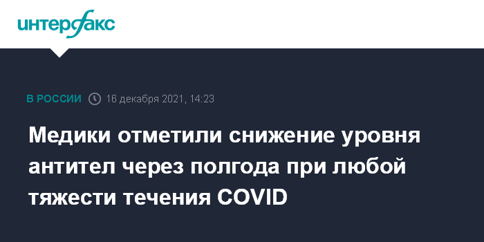 Москва. 16 декабря. INTERFAX.RU - Спустя 180 дней после заболевания COVID-19 у большинства пациентов наблюдается снижение концентрации антител класса IgG к спайковому (S) белку коронавируса как при легком, так и при тяжелом течении болезни, следует из результатов исследования "Отклик", проведенного Военно-медицинской академией (ВМА) им.Кирова и лабораторной службой "Хеликс".