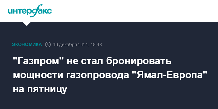 Москва. 16 декабря. INTERFAX.RU - "Газпром" не стал бронировать мощности польского участка магистрального газопровода "Ямал-Европа" на пятницу, свидетельствуют итоги аукциона на платформе бронирования GSA Platform.