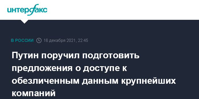 Москва. 16 декабря. INTERFAX.RU - Президент РФ Владимир Путин поручил правительству и Банку России подготовить предложения о предоставлении доступа организациям, разрабатывающим технологические решения с применением искусственного интеллекта, и научным организациям к обезличенным данным из информационных систем крупнейших организаций.