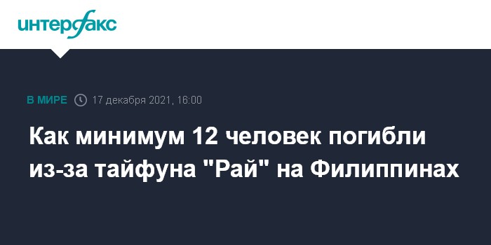 Москва. 17 декабря. INTERFAX.RU - Как минимум 12 человек погибли в результате тайфуна "Рай" (Rai), который обрушился на Филиппины в четверг, сообщает в пятницу агентство Associated Press.