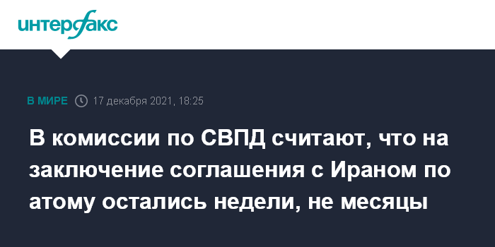 Москва. 17 декабря. INTERFAX.RU - У участников венских переговоров по возвращению США и Ирана к обязательствам по СВПД остается несколько недель для выработки соглашения в отношении ситуации вокруг иранской ядерной программы. Об этом заявил в пятницу координатор Совместной комиссии по СВПД Энрике Мора.