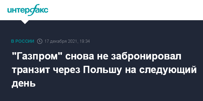 Москва. 17 декабря. INTERFAX.RU - "Газпром" как и днем ранее не стал бронировать в ходе регулярного аукциона (который завершается в 19:00 по Москве) транзит через Польшу по газопроводу "Ямал-Европа" на следующий день, свидетельствуют данные платформы бронирования GSA Platform.