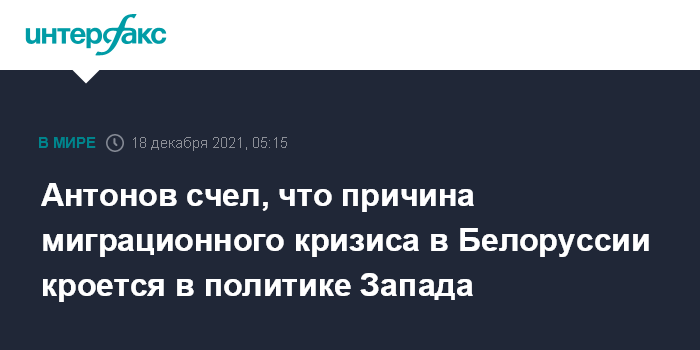 Москва. 18 декабря. INTERFAX.RU - Политика США и Запада стала основной причиной кризиса с мигрантами на белорусско-польской границе, сказал посол России в Вашингтоне Анатолий Антонов в интервью американскому изданию Newsweek.