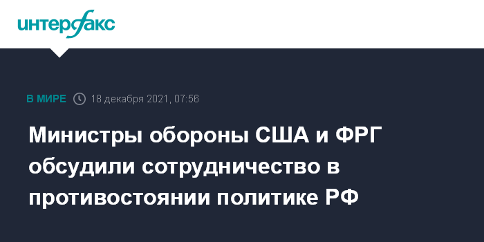 Москва. 18 декабря. INTERFAX.RU - Министры обороны США Ллойд Остин и Германии Кристина Ламбрехт в ходе телефонной беседы обсудили вопросы, касающиеся противодействия политике России в Восточной Европе, сообщил Пентагон.