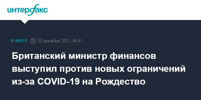 Москва. 20 декабря. INTERFAX.RU - Министр финансов Великобритании Риши Сунак присоединился к 10 министрам британского кабинета, которые в условиях распространения варианта коронавируса "омикрон" выступают против введения новых ограничений перед Рождеством, сообщило издание The Times.