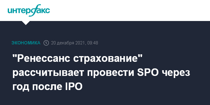 Москва. 20 декабря. INTERFAX.RU - ПАО "Группа Ренессанс страхование", которое в октябре этого года разместило акции на Московской бирже, рассчитывает провести SPO через год после первичного предложения, рассказал в интервью "Интерфаксу" президент и председатель совета директоров компании, ее совладелец Борис Йордан.