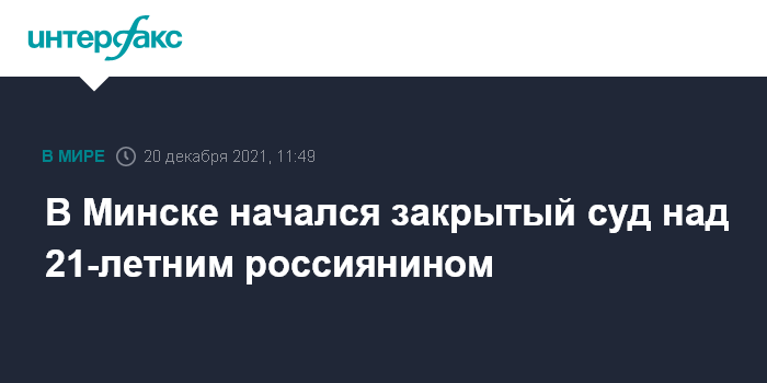 Москва. 20 декабря. INTERFAX.RU - Минский городской суд начал рассматривать уголовное дело 21-летнего россиянина Егора Дудникова, процесс будет закрытым, сообщил правозащитный центр "Весна". В "Весне" Дудникова считают политзаключенным.