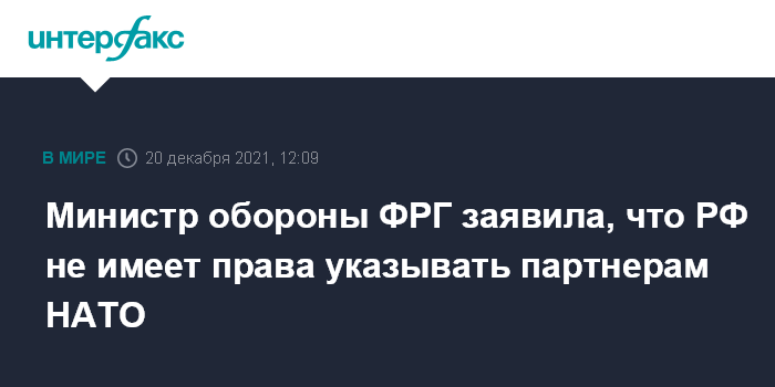 Москва. 20 декабря. INTERFAX.RU - У России нет никакого права указывать партнерам НАТО, заявила находящаяся в Литве министр обороны Германии Кристина Ламбрехт, комментируя российский проект соглашения о мерах обеспечения безопасности РФ и государств-членов НАТО.