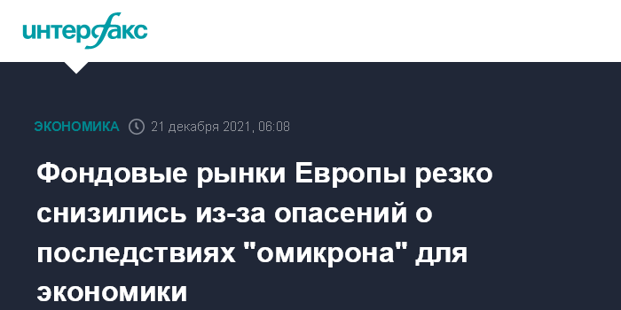 Москва. 21 декабря. INTERFAX.RU - Европейские фондовые рынки завершили первые торги этой недели резким падением в связи с растущими опасениями, что распространение нового штамма COVID-19 "омикрон" потребует ужесточения карантинных мер по всему миру и ослабит экономический рост.