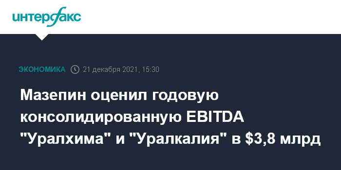 Москва. 21 декабря. INTERFAX.RU - Консолидированная EBITDA "Уралхима" и "Уралкалия" за 2021 год может составить $3,8 млрд, заявил телеканалу "Россия 24" владелец компаний Дмитрий Мазепин.