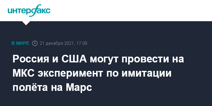 Москва. 21 декабря. INTERFAX.RU - Россия и США обсуждают проведение на Международной космической станции (МКС) эксперимента по имитации полёта на Марс, сообщил заместитель директора института медико-биологических проблем РАН Олег Котов.