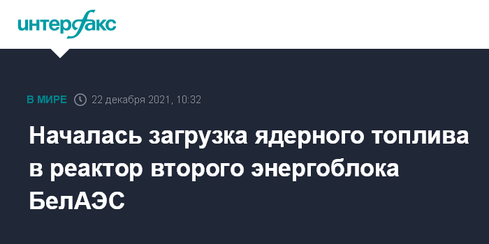 Москва. 22 декабря. INTERFAX.RU - Загрузка ядерного топлива начата в реактор второго энергоблока БелАЭС, начинается этап физического пуска энергоблока, сообщило Минэнерго Белоруссии.