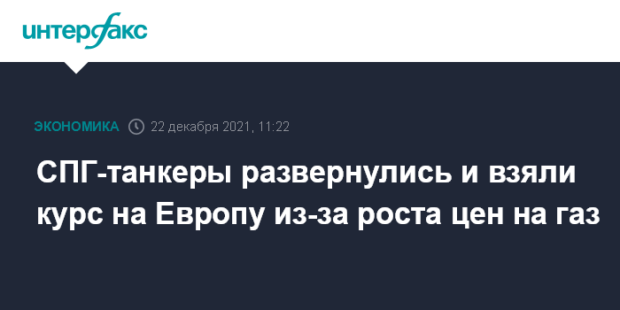 Москва. 22 декабря. INTERFAX.RU - Танкеры со сжиженным природным газом (СПГ), направляющиеся в Азию, меняют свои маршруты и поворачивают в сторону Европы, где цены на газ вновь обновили рекордные максимумы, пишет Financial Times.