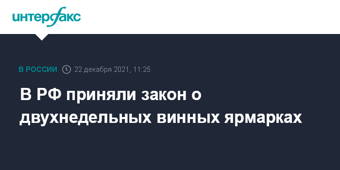 Москва. 22 декабря. INTERFAX.RU - Госдума приняла в окончательном, третьем чтении закон, который позволяет устраивать в России ярмарки российской винодельческой продукции и вина из стран Евразийского экономического союза (ЕАЭС); срок их проведения – не более 14 дней, при этом для данных мероприятий вводятся законодательные послабления по рекламе и объектам их размещения.