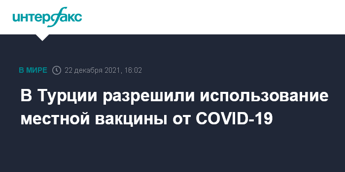 Москва. 22 декабря. INTERFAX.RU - Минздрав Турции разрешил экстренное применение местной вакцины от коронавируса Turkovac, сообщает Anadolu со ссылкой на заявление министра здравоохранения Фахреддина Коджу.