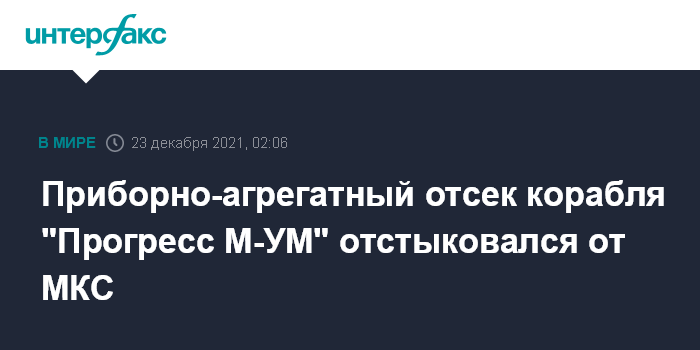 Москва. 23 декабря. INTERFAX.RU - Приборно-агрегатный отсек корабля "Прогресс М-УМ" расстыковался с Международной космической станцией (МКС) для последующего затопления в Тихом океане, следует из трансляции "Роскосмоса".