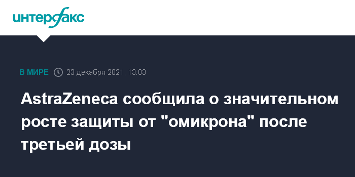 Москва. 23 декабря. INTERFAX.RU - Бустерная третья доза вакцины компании AstraZeneca от коронавируса приводит к значительному росту уровня антител против штамма "омикрон". Об этом сообщается в пресс-релизе компании со ссылкой на лабораторные исследования.