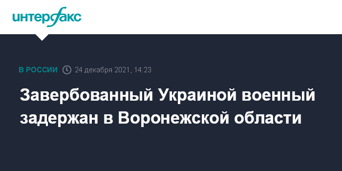 Москва. 24 декабря. INTERFAX.RU - ФСБ сообщает о задержании в Воронежской области российского военного, завербованного украинской военной разведкой, он арестован по подозрению в госизмене.