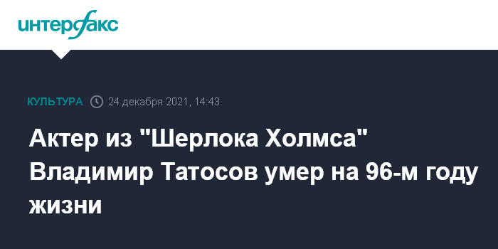 Москва. 24 декабря. INTERFAX.RU - Народный артист РСФСР, актер из известного фильма "Шерлок Холмс и доктор Ватсон: Двадцатый век начинается" Владимир Татосов скончался в возрасте 95 лет после продолжительной болезни, сообщается на сайте Союза кинематографистов России.