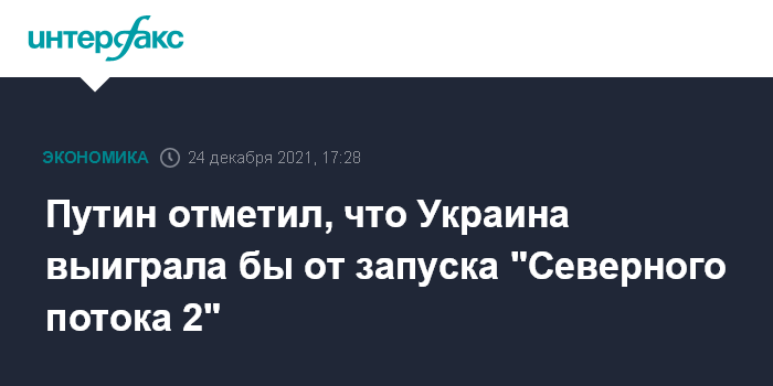 Москва. 24 декабря. INTERFAX.RU - Украина выиграла бы от запуска "Северного потока 2" за счет снижения цен на спотовом рынке Европы, откуда страна закупает для себя газ. Об этом заявил президент России Владимир Путин на совместном заседании Государственного Совета и Совета при Президенте по науке и образованию.