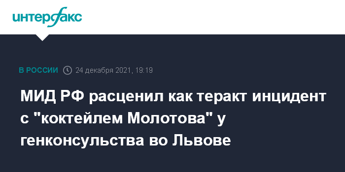 "Сегодня, 24 декабря в 02:30 ночи по местному времени против Генерального консульства России во Львове был совершен террористический акт. Неизвестный бросил в направлении входа на территорию учреждения бутылку с зажигательной смесью, которая воспламенилась и создала угрозу безопасности загранучреждения. По счастливой случайности никто из сотрудников не пострадал", - заявили на Смоленской площади.
