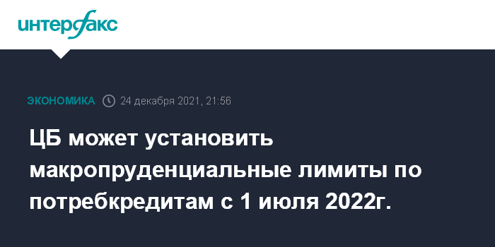 Москва. 24 декабря. INTERFAX.RU - Совет директоров Банка России утвердил нормативный акт по макропруденциальным лимитам (количественные ограничения на выдачу необеспеченных займов). После его регистрации он рассмотрит вопрос об установлении с 1 июля 2022 года этих лимитов по потребительским кредитам и займам для банков и микрофинансовых организаций, говорится в сообщении ЦБ.