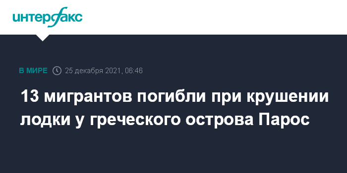 Москва. 25 декабря. INTERFAX.RU - По меньшей мере 13 человек погибли в результате крушении лодки у берегов греческого острова Парос поздним вечером в пятницу, сообщает The Guardian.